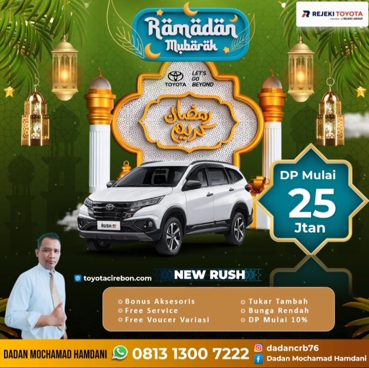Promo spesial Ramadhan New Rush 2026 Dp 25 Jt an angsuran kes tempo bunga mulai 0% tenor maksimal bisa sampai 8 tahun, juga bisa tradin mobil lama anda untuk semua merk. Juga pelayan T-CARE adalah program bebas biaya jasa servis dan suku cadang sebanyak 7 kali selama 3 tahun / 60.000 km beserta Extended Warranty 1 tahun / 20.000 km dengan servis secara rutin 6 bulan sekali.